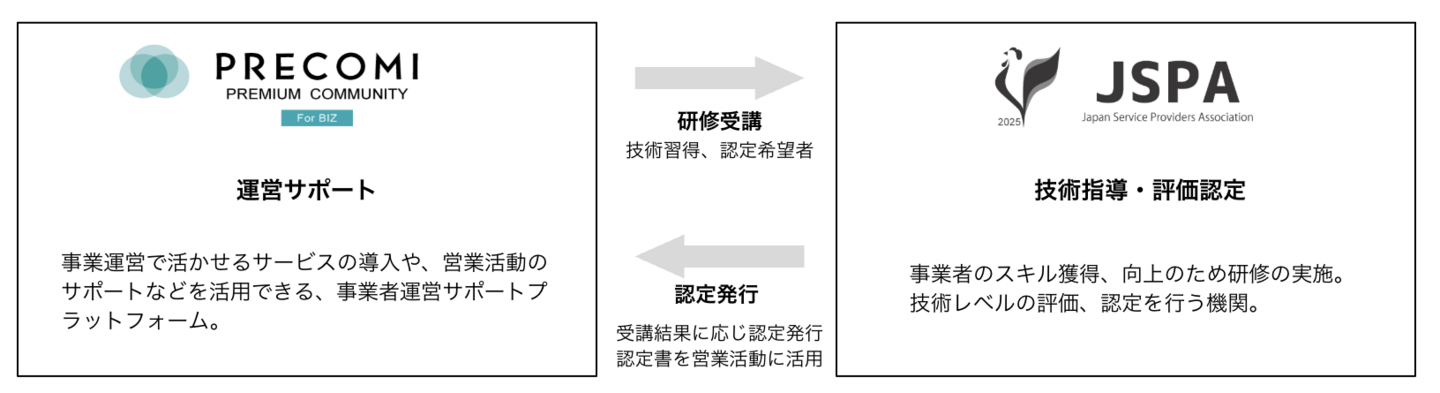 日本サービス事業者協会は、事業運営サポートのプラットフォーム「プレコミ」と連携を行っています。協会では技術指導、スキルに応じた認定を行いますが、プレコミでは事業運営に不可欠な営業ツール、販促ツール、サービスツールなど事業運営のサポートを行います。プレコミとの連携により、事業運営を全方位でサポートいたします。